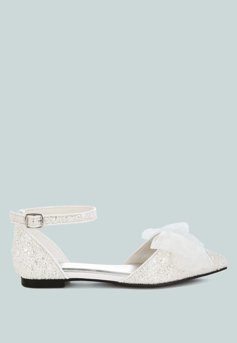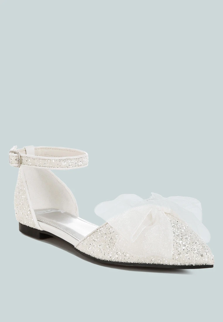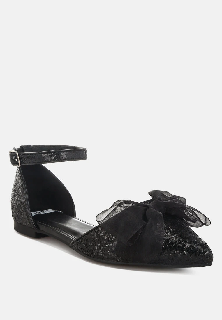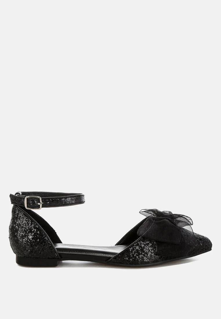 How stunning are these glitter flat sandals! Featuring a delicate sheer bow on the vamp and secured with adjustable pin buckle ankle straps, they also offer comfort with cushioned insoles. Style these pointed-toe beauties with a flowy dress for a stylish day out.