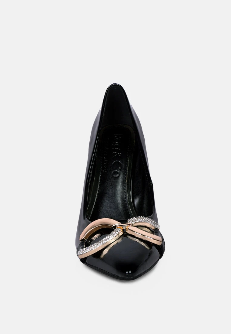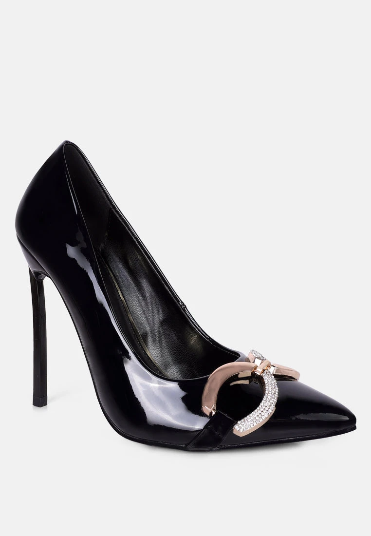 The shoes are sleek, slender, and chic with the touch of rhinestone and gold embellishment on the front which elevates the whole look of the sandals. The pump shoes have cushion padded innersole that offers comfort and cuts strain. The style is a classic and would look lovely as party heels for bachelorette and cocktail parties.