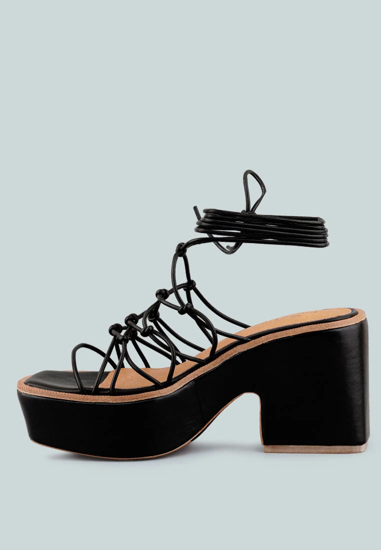 The tie up sandals have a ravishing aesthetic with the fine knotted detail on the front. The heel is short but the platform element elevates the height as well as the look of the sandals. The fancy sandals are constructed with fine craftsmanship and are ideal for parties such as cocktails, bachelorettes, even weddings as wedding guest shoes.