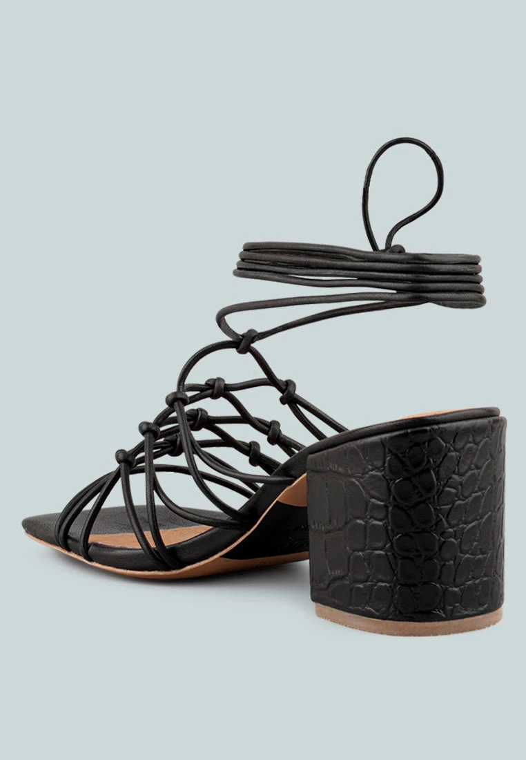 The sandals are simply ravishing with the knotted vamp and lace up design. The overall aesthetic is very chic with the croc texture. The fancy sandals are ideal for a bachelorette party or even brunch outings during the holiday season.