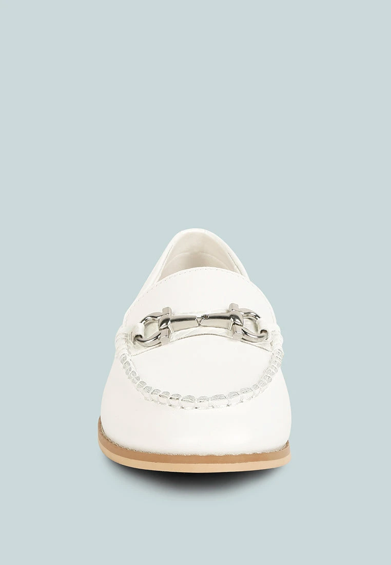 Vintage classic black loafers with flat heels and metallic horsebit embellished. The mock stitch detail adds a modern dimension to the classic favourite loafers.