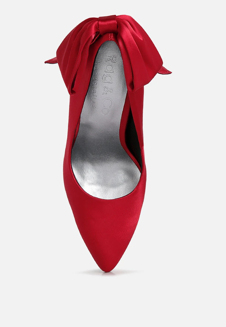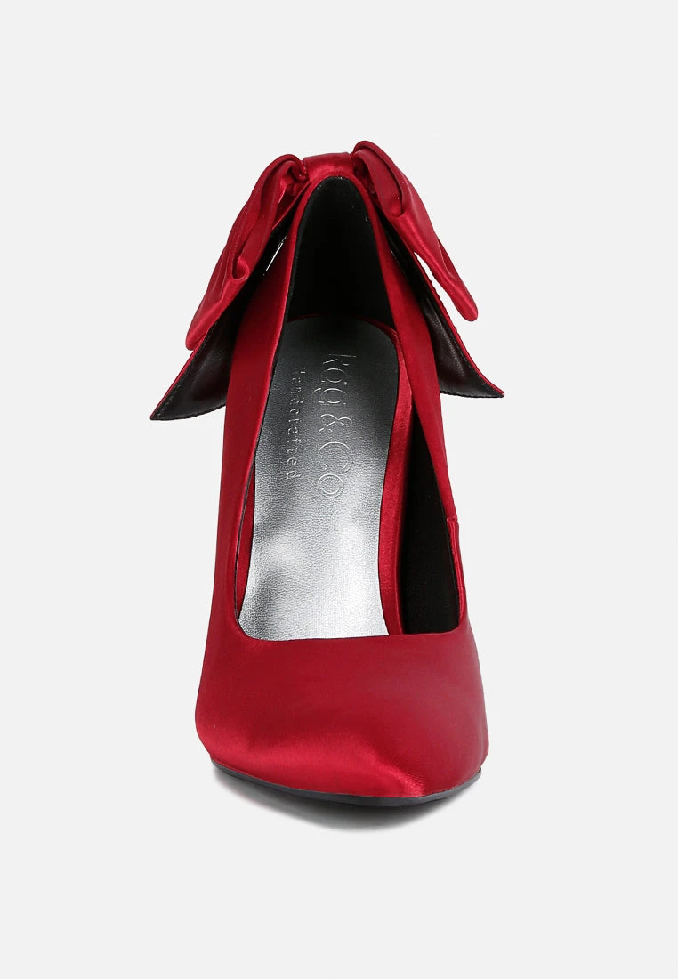 Stiletto heel pumps in satin with bow embellishment at the back – the perfect evening shoe for all your special occasions such as weddings, parties, Red-tie events, etc. The party heels come with lightly cushioned insole which cuts strain.