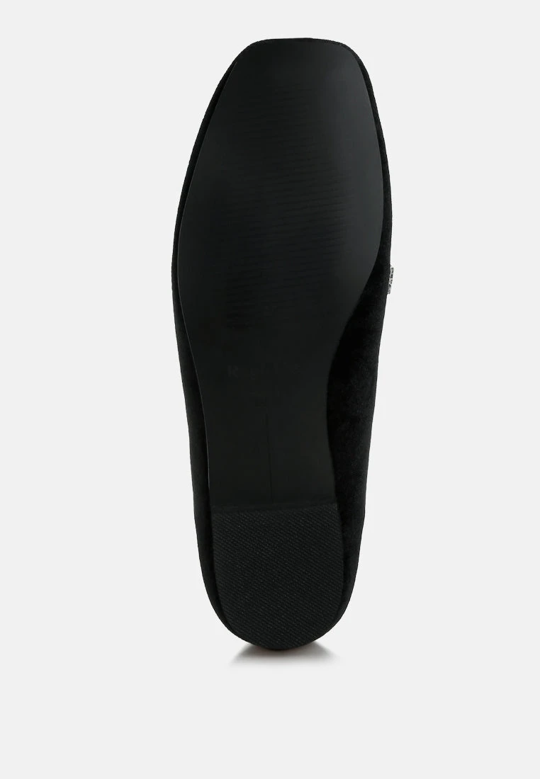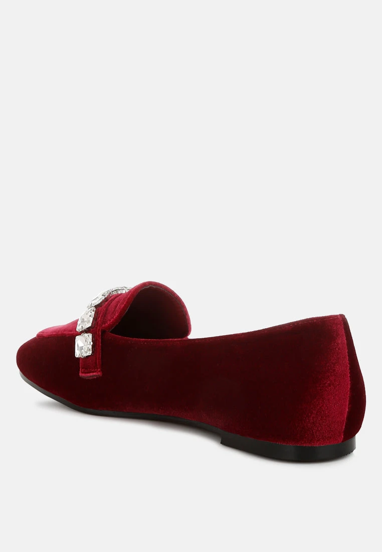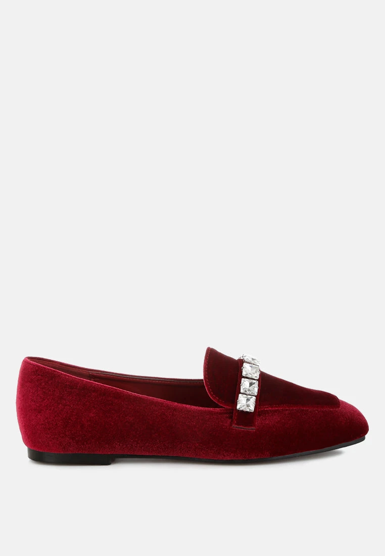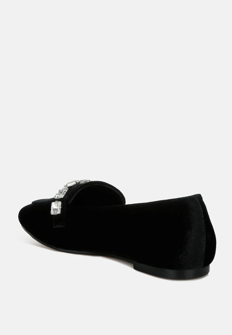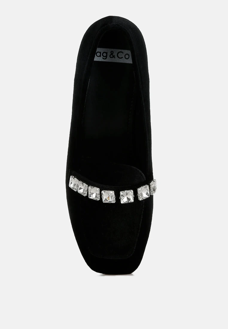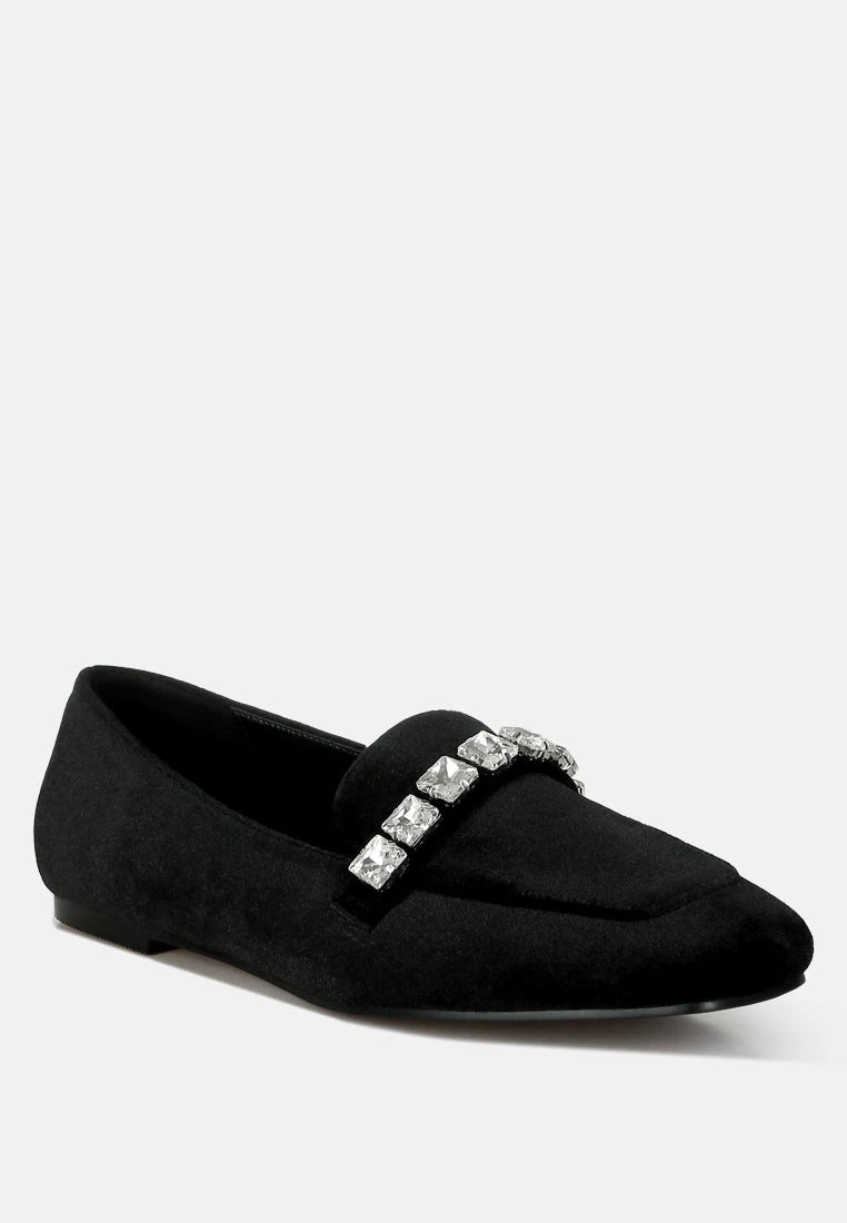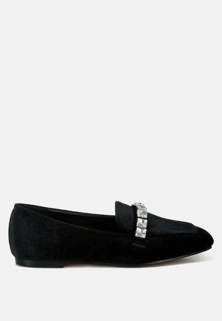 The luxurious velvet loafer is a truly exquisite piece. It features a stunning diamante-embellished strap, plush cushioned insoles, and comfortable flat heels. Ideal for pairing with evening gowns, tailored trousers, and everything in between, these closed-square-toed loafers offer unparalleled versatility.
