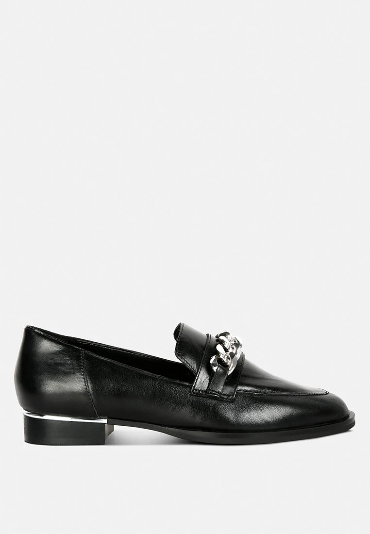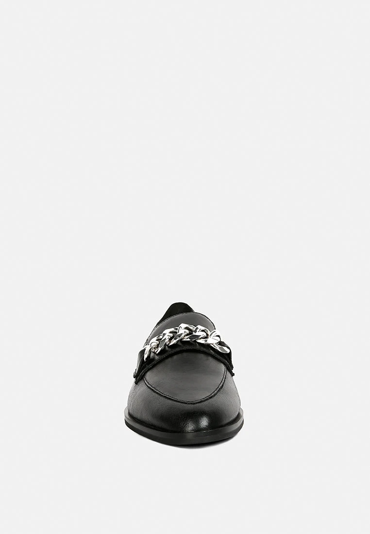 Black Semi Casual Leather Slip-on Loafers with Metallic Chain Detail: looks good and feels good with style and comfort guaranteed. Shine from top to bottom and be prepared for the day ahead with this. You are ready to hit the high street with these in your closet.