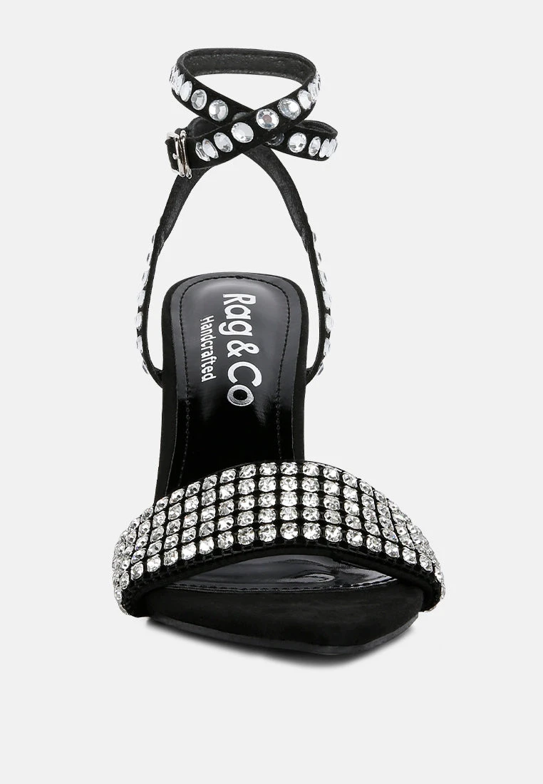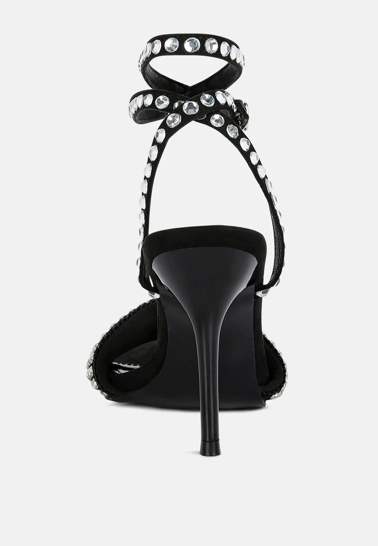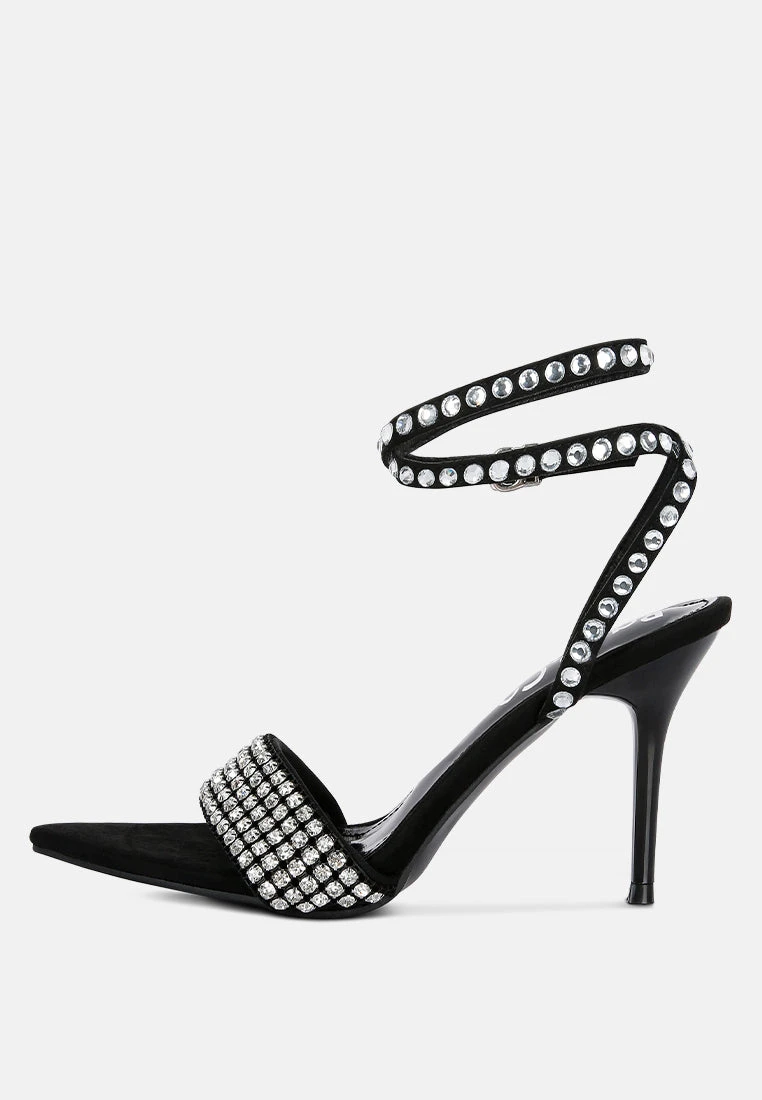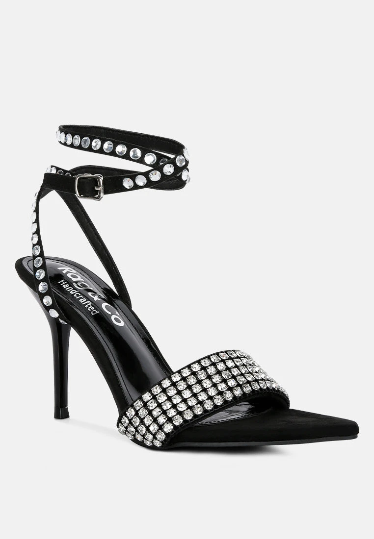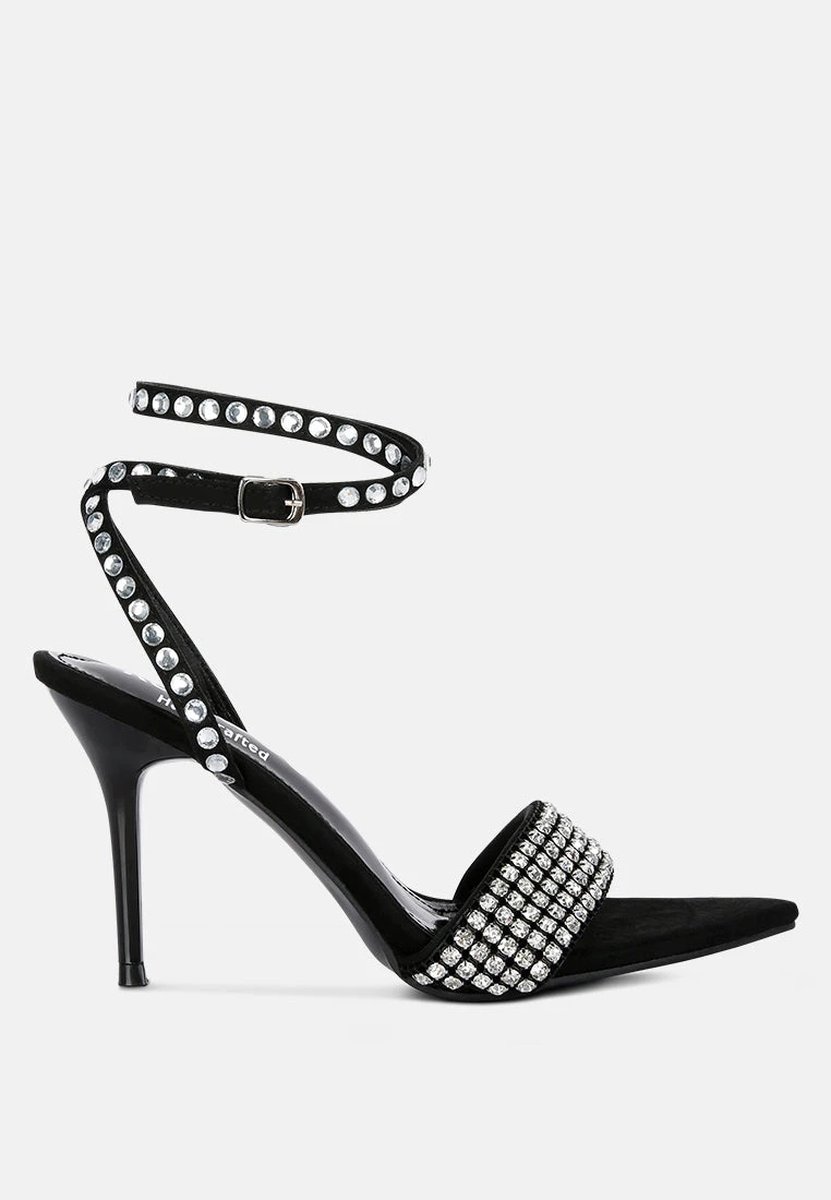 Diamante embellished beauties, the stiletto sandals are stunning with the diamante set ankle straps and front vamp. The pin buckle fastening secures feet properly and soft insole is easy on the feet. These would be simply stunning paired with a cocktail dress for parties or weddings.
